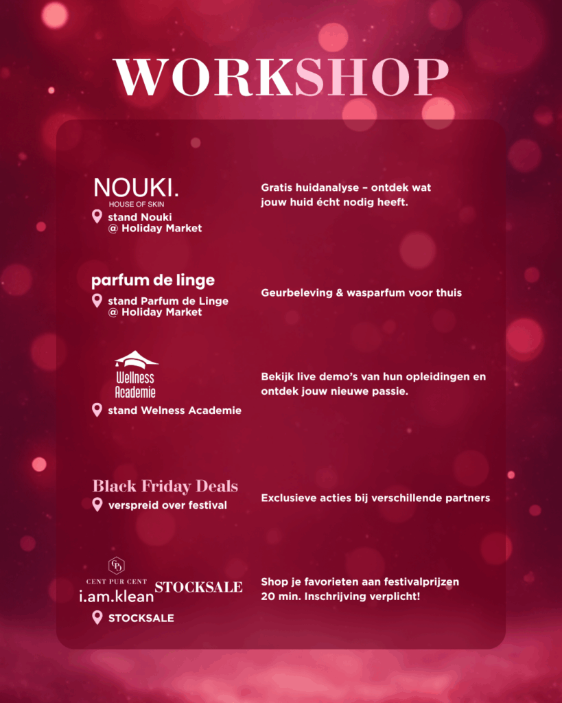 Wat je mag verwachten? Workshops en masterclasses in beauty, fashion en lifestyle. Ontdek je favoriete merken van dichtbij, scoor unieke eindejaarscadeautjes op onze Holiday Market, shop erop los in de Cent Pur Cent & i.am.klean Holiday Shops én op de grote stocksale.